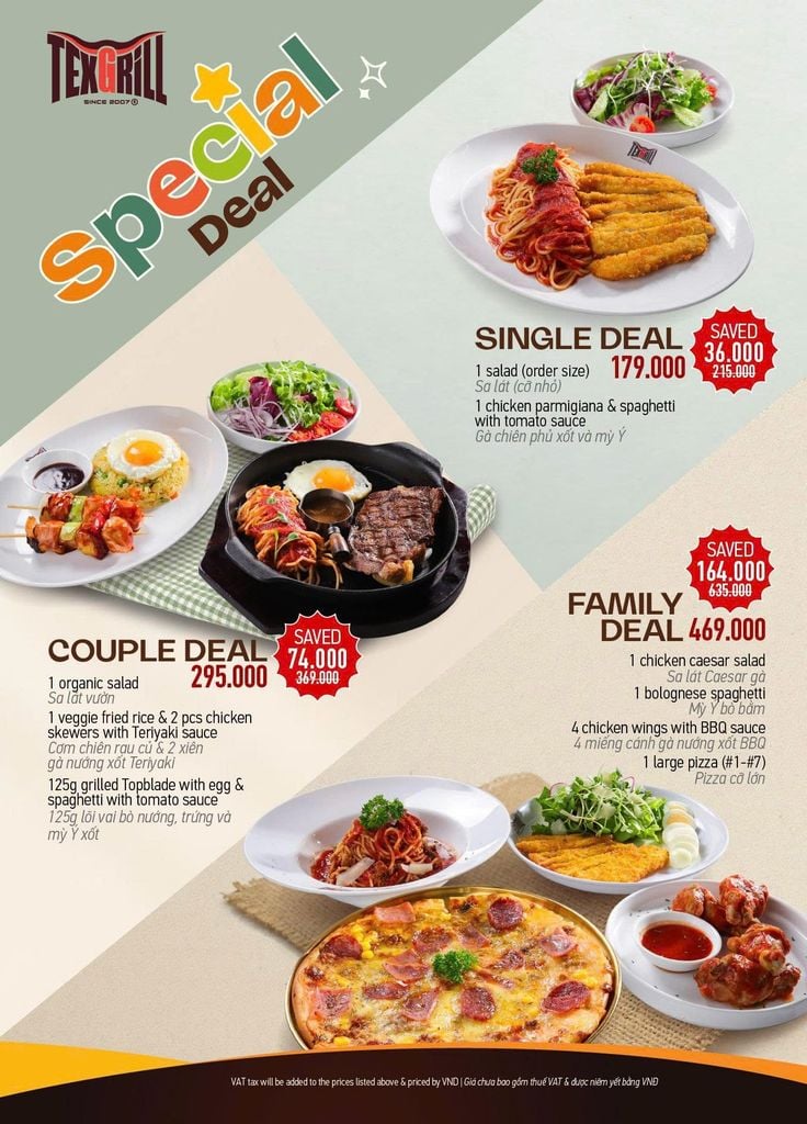 Thưởng thức món Âu thượng hạng từ lõi vai bò nướng, hay mỳ Ý xốt, pizza cỡ lớn, cánh gà nướng xốt BBQ,... mà chỉ từ 149K/người, tin được không? Ghé ngay TexGrill cơ sở gần nhất (trừ Vũ Yên) trải nghiệm thực đơn mới SPECIAL DEAL (từ 05.11.2025) với mức giá vô cùng tiết kiệm.